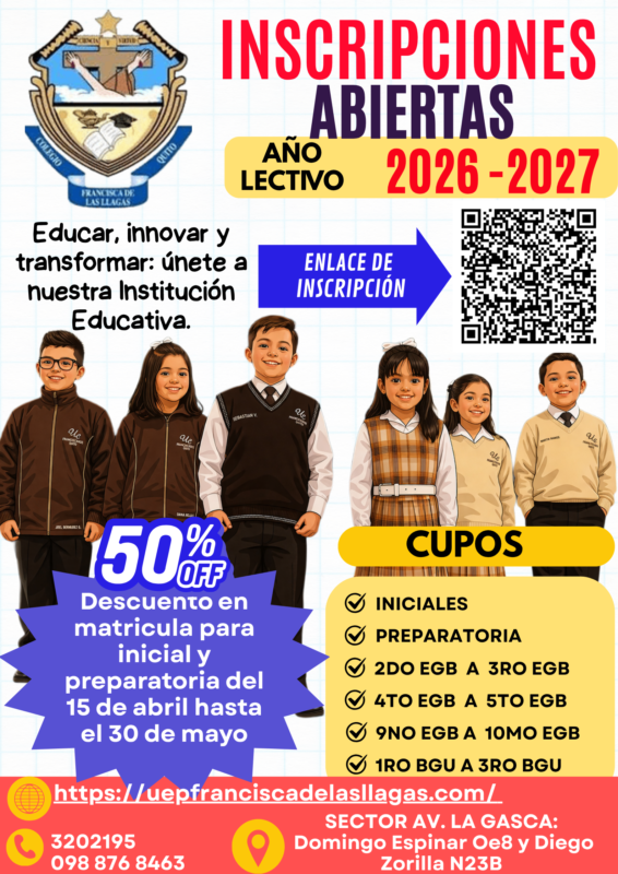 Entendemos que la elección de una institución educativa es una de las decisiones más importantes. Por ello, en el Colegio Francisca de las Llagas ofrecemos una formación integral que fusiona la excelencia académica con sólidos valores franciscanos. Para nuestros estudiantes, cada día es una oportunidad para descubrir sus talentos y alcanzar su máximo potencial en un ambiente de fraternidad y respeto. Para los padres de familia, es la tranquilidad de saber que sus hijos están construyendo las bases para un camino de éxito y realización personal. ¡El primer paso hacia ese brillante futuro comienza aquí!
